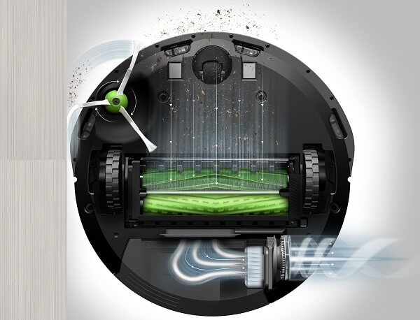iRobot Roomba i7 е оборудвана с патентована 3-степенна почистваща система AeroForce, която концентрира въздушния поток в тясното пространство между въртящите се четки. Това води до ускорение на въздуха, което, в комбинация с високо ефективния мотор, увеличава всмукателната мощ на робота до 10 пъти*. 1. Въртяща се странична четка